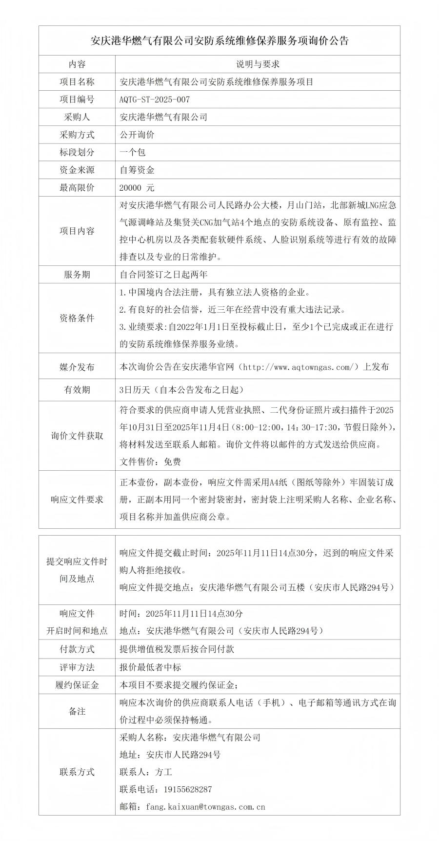 安慶港華燃氣有限公司安防系統(tǒng)維修保養(yǎng)服務(wù)項詢價公告