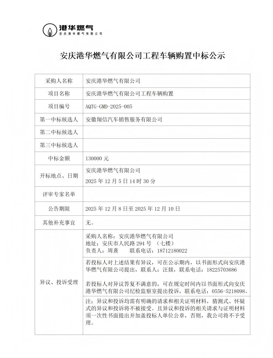 安慶港華燃?xì)庥邢薰竟こ誊囕v購置中標(biāo)公示