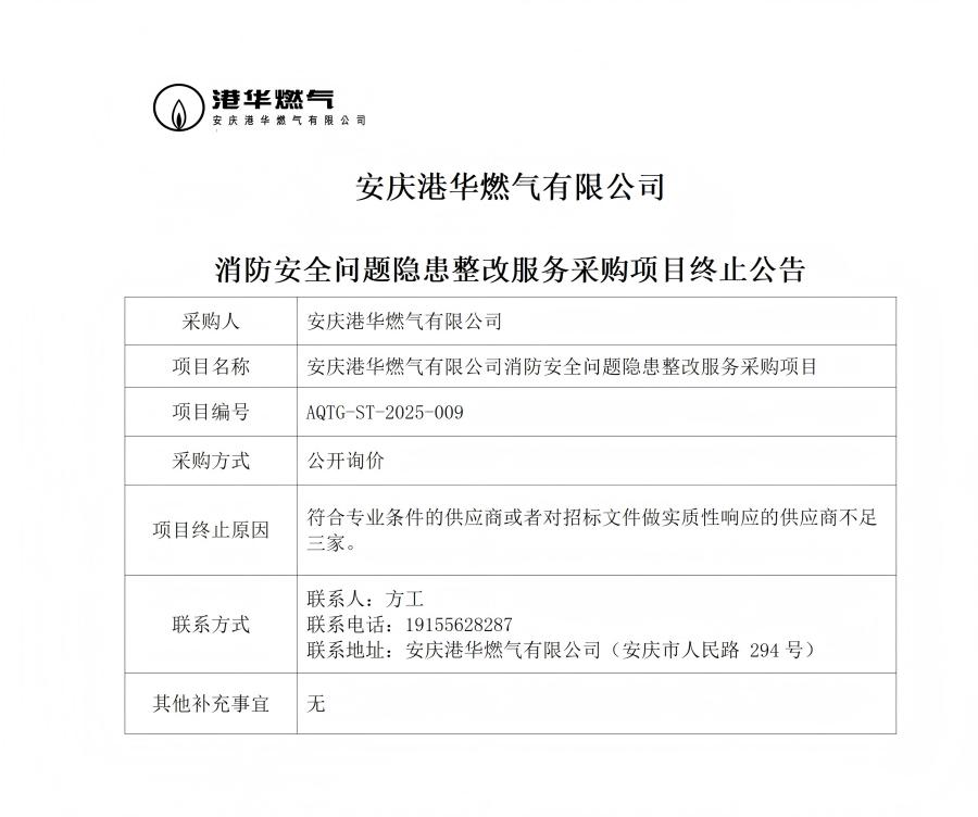 安慶港華燃氣有限公司消防安全問題隱患整改服務(wù)采購項目終止公告